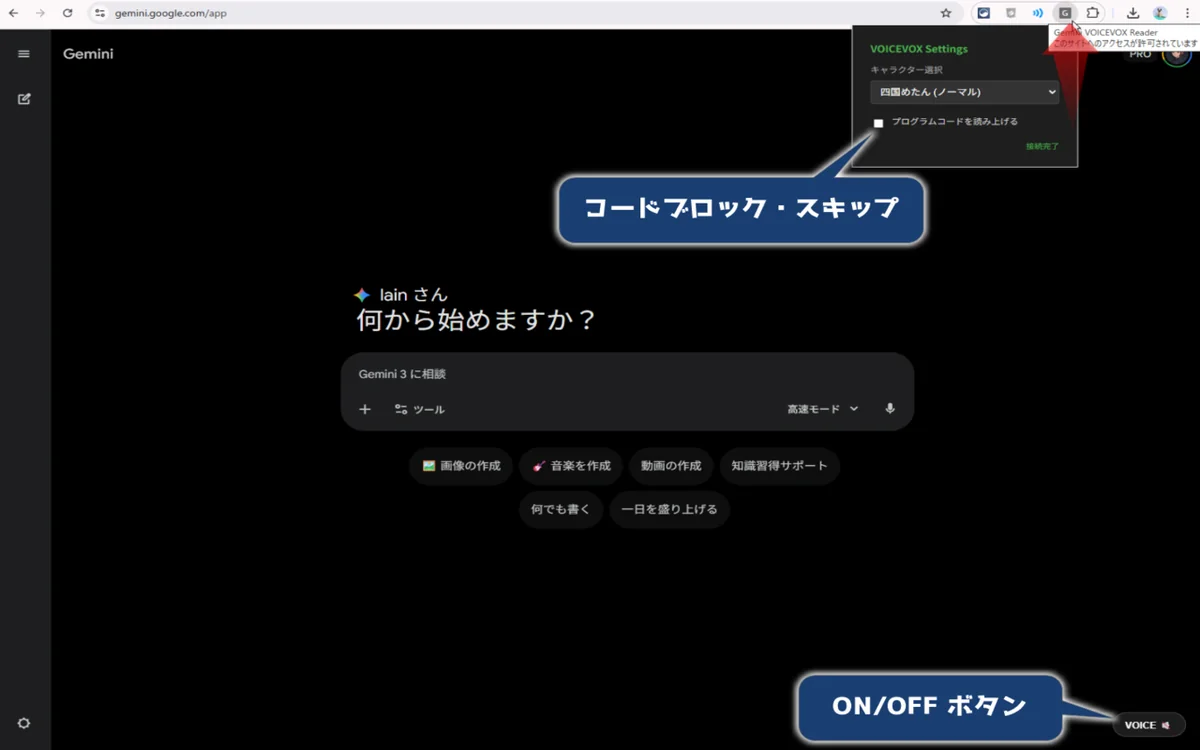 Gemini の回答を自動的に検知し、ローカルで動作する「VOICEVOX」エンジンを通じて即座に音声で再生する拡張機能を作成しました。