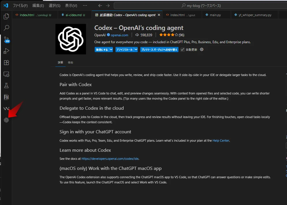 - 拡張が追加されると、サイドバーに「Codex」アイコンが表示される