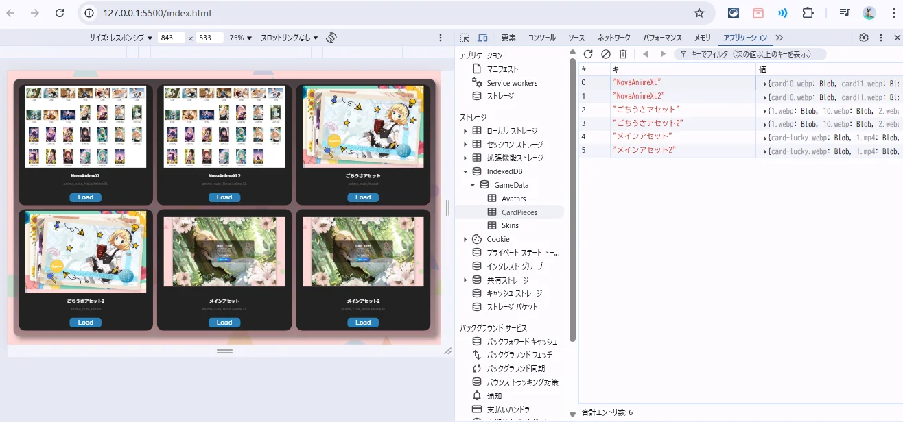 でこの中で、ZIP展開とindexedDBへの保存と管理、更に、各アセットを閲覧できるところまで実装済みで、 この後、UIを設計して、ブログ記事のようになってる各カード(ZIP ➔ indexedDB ➔ オブジェクトデータ )を タップでスワイプ、読込み、削除、ゲームへ反映など実装していくことになると思います。
