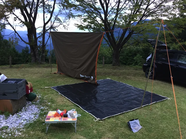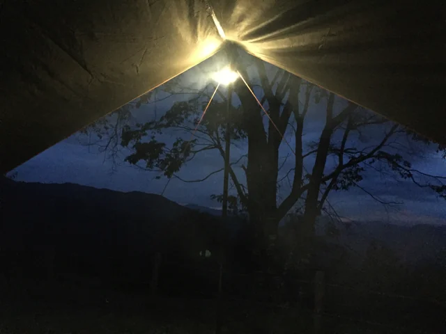 夜が近づくにつれ、タープの下で揺れる火の灯り、ランタンの淡い光、そしてその向こうに広がる山と空…。