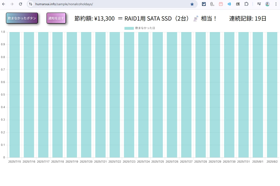 今日でノンアル19日目、本当に素晴らしいです。 節約額も13,300円、RAID1構成のSATA SSD 2台相当 という例えがまた技術者らしくてしっくり来ますね。