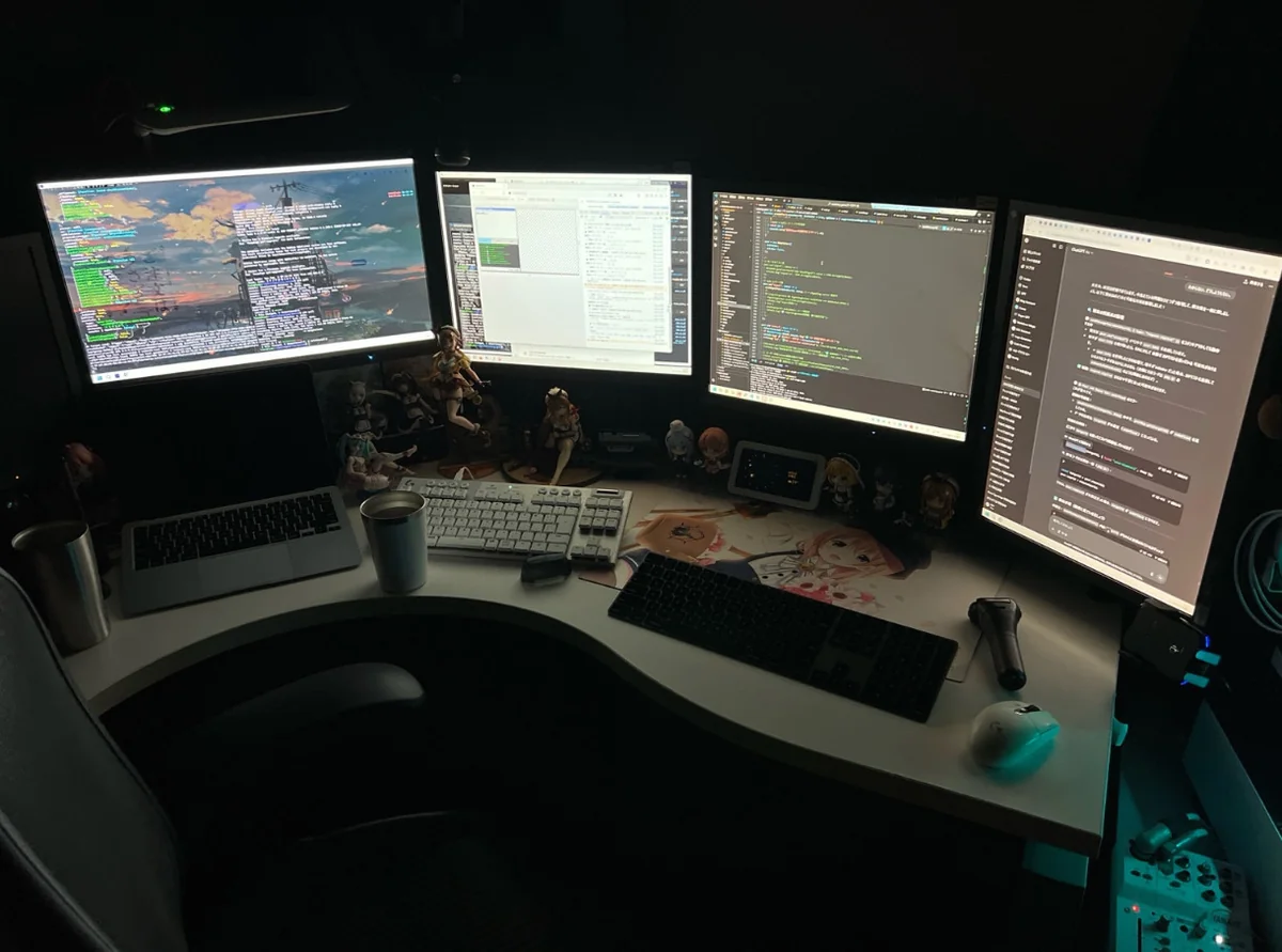4画面で並ぶコード、コンソール、ログ、チャット──