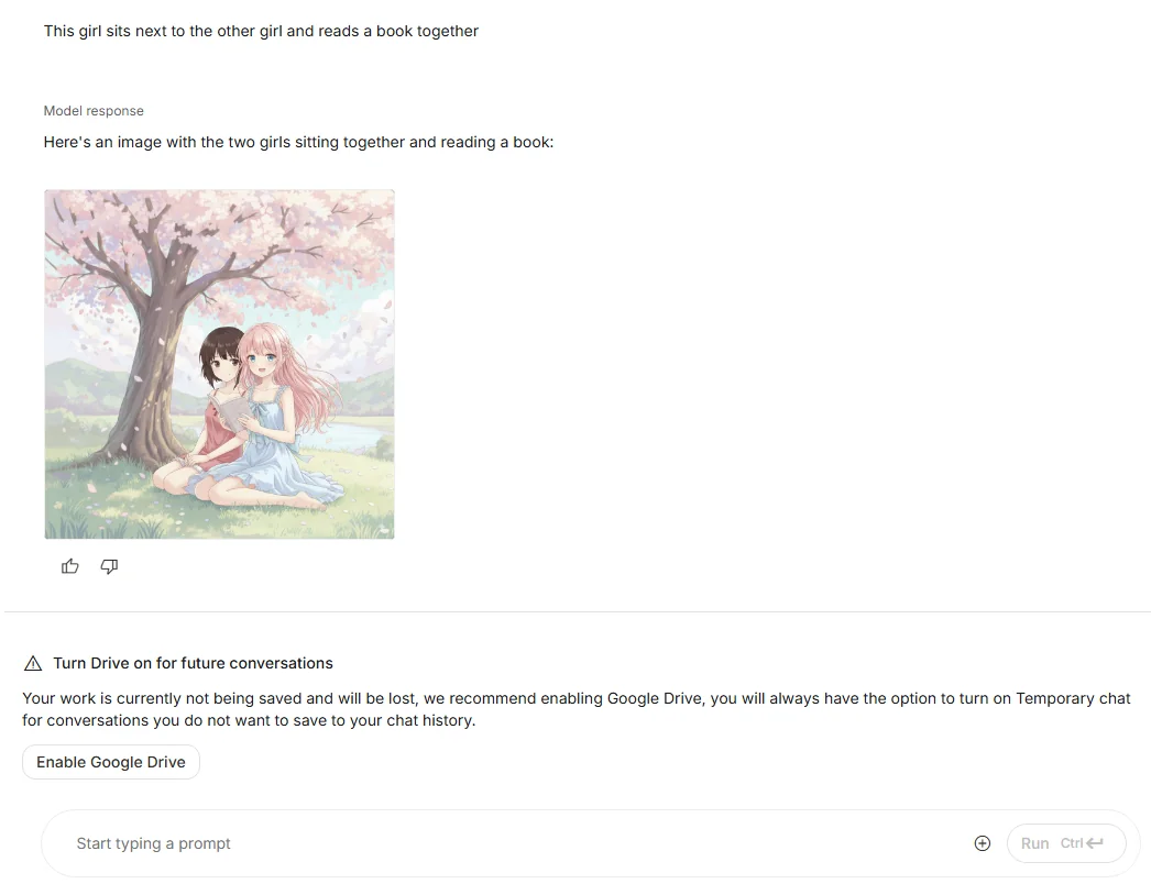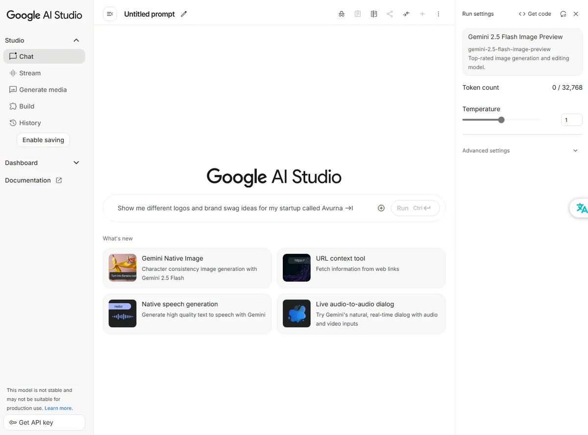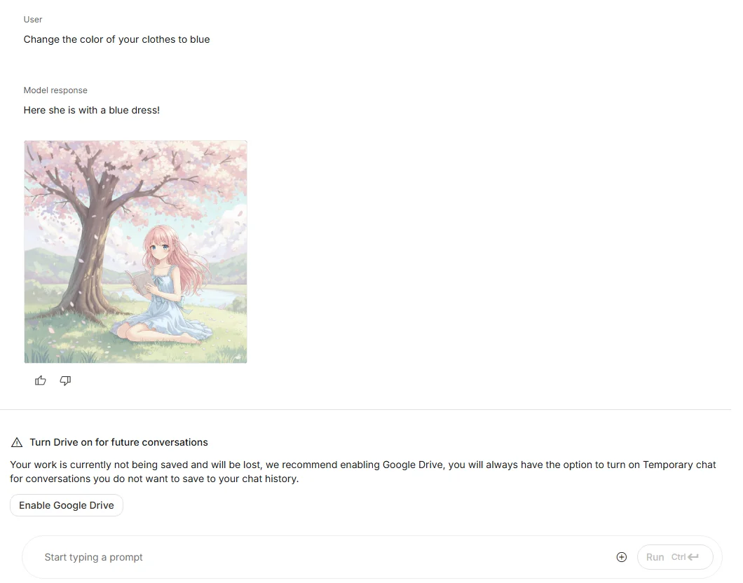 最も手軽に試せるのが Google AI Studio です。 ブラウザから直接アクセスでき、プロンプトを入力してすぐに画像生成や編集を体験できます。サンプルも豊富で、「背景のぼかし」「オブジェクトの削除」「人物の服装変更」などのテンプレートがあらかじめ用意されているのが魅力です。 → 「とにかくまず触ってみたい」という人には、このルートがおすすめです。