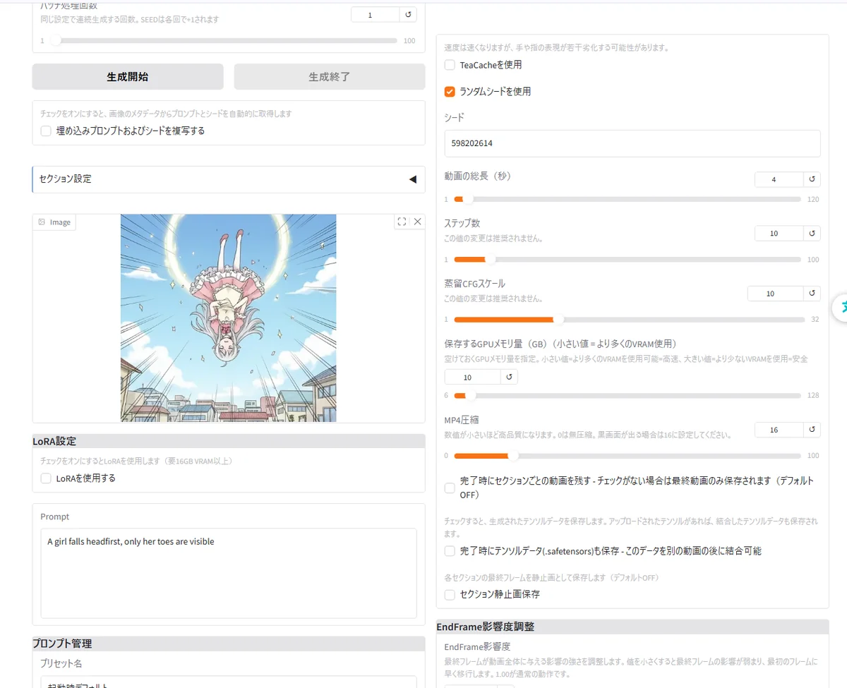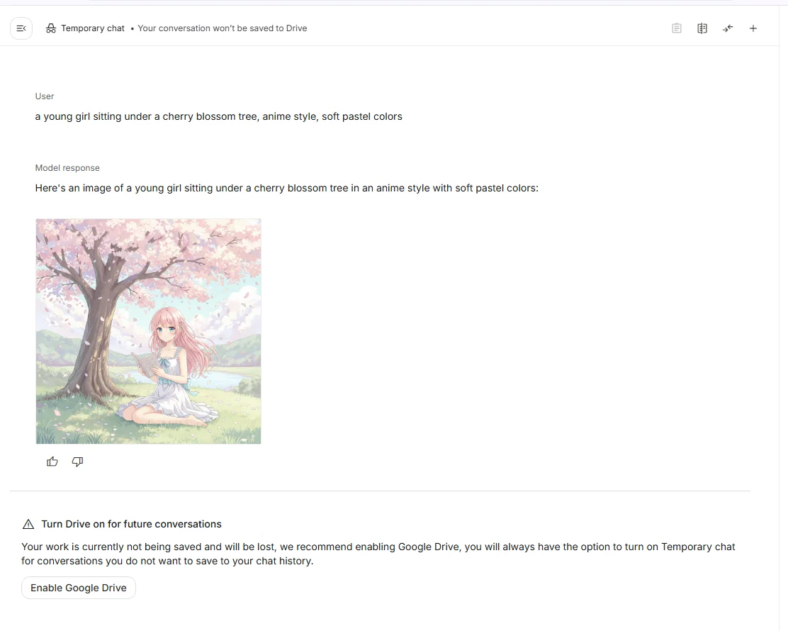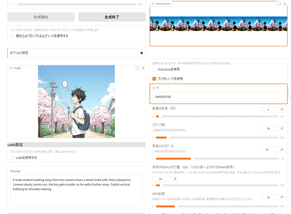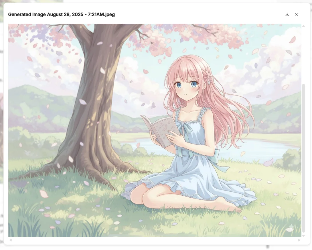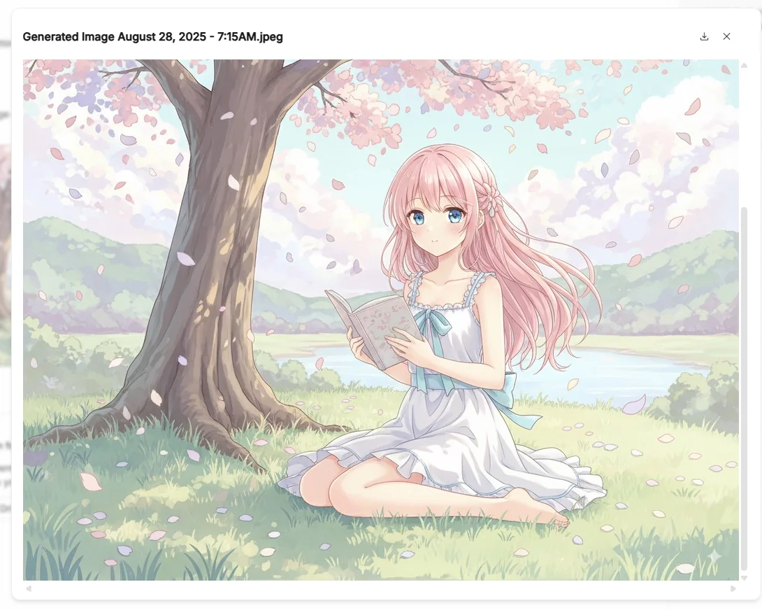 これだけで桜の下に座る少女のイラストが生成されます。 Stable Diffusion と比べると「破綻の少なさ」「キャラの統一感」が際立ち、短い文章でも安定した出力が得られるのが印象的です。