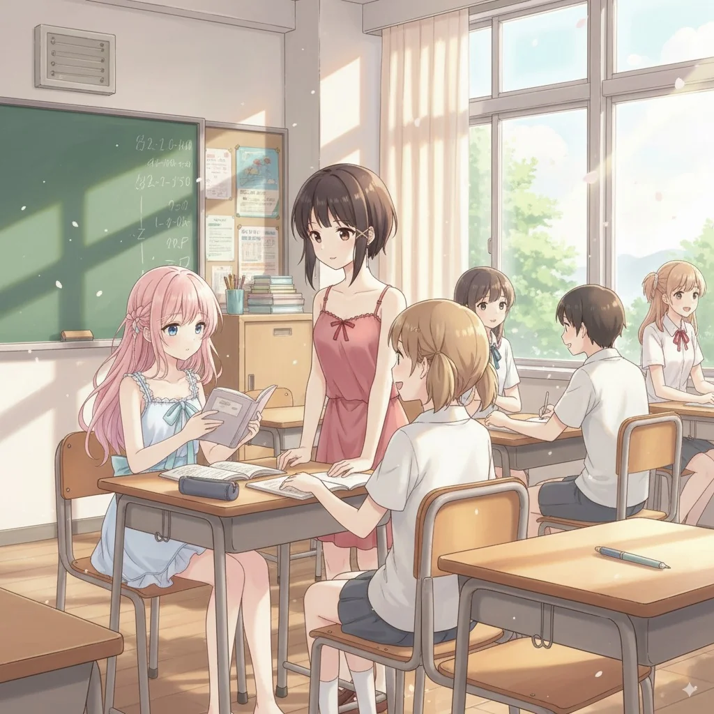 The background is a school classroom, and a girl is sitting at a desk reading a book. A girl in red is standing and talking to another girl.