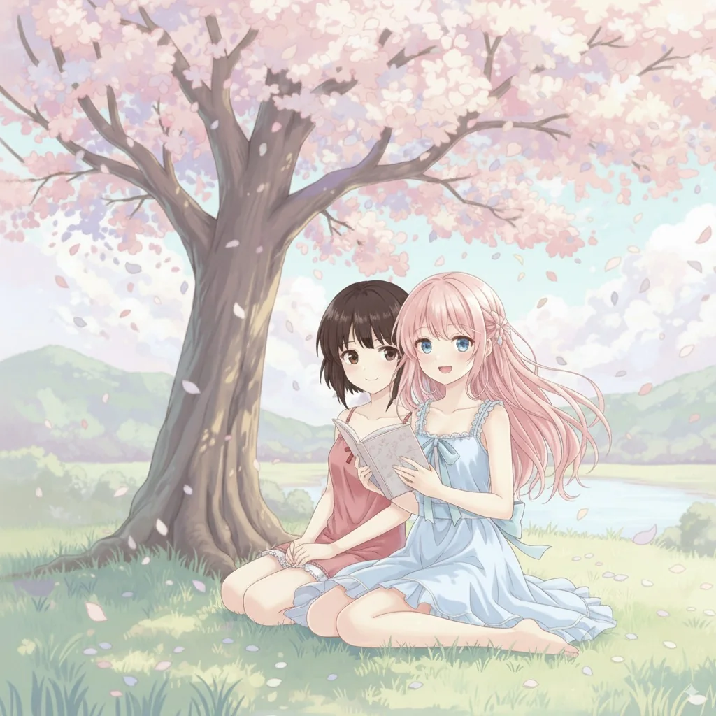 a young girl sitting under a cherry blossom tree, anime style, soft pastel colors