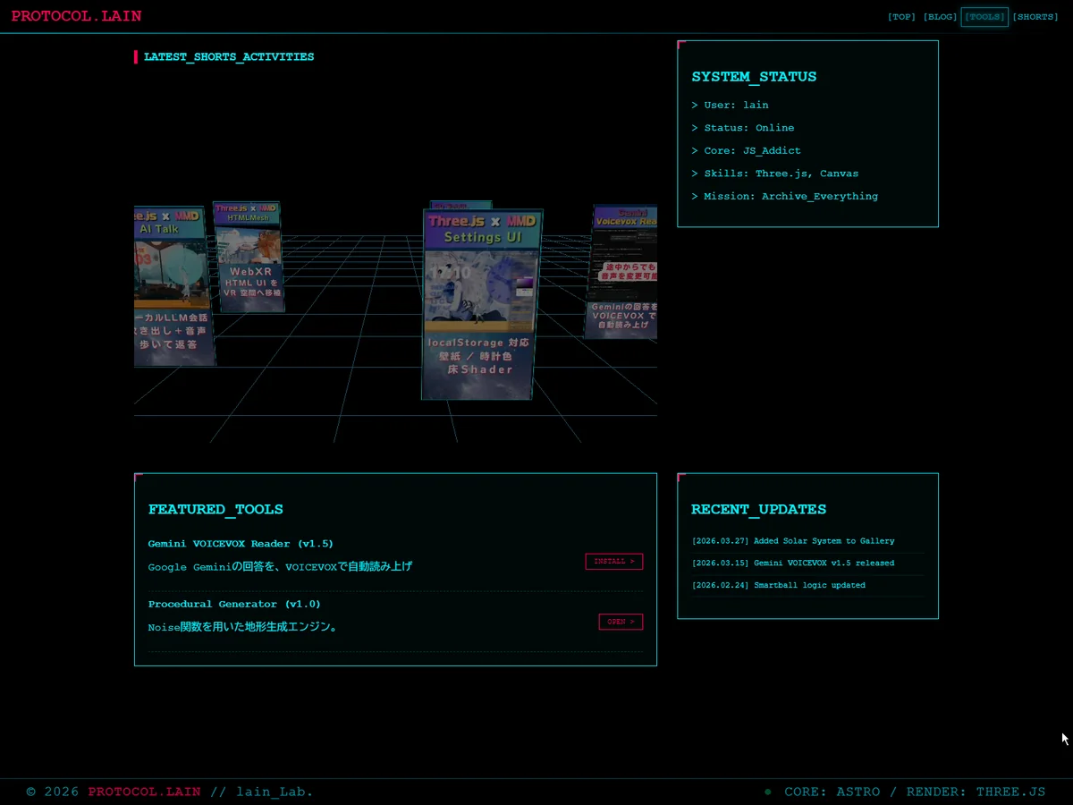 PROTOCOL.LAINの TOOLS セクションにおいて、過去のYouTube Shortsや動画コンテンツを3D空間上に配置し、スワイプで回転・クリックで実体化するカルーセルUI(ShortsCarousel.tsx)を実装しました。