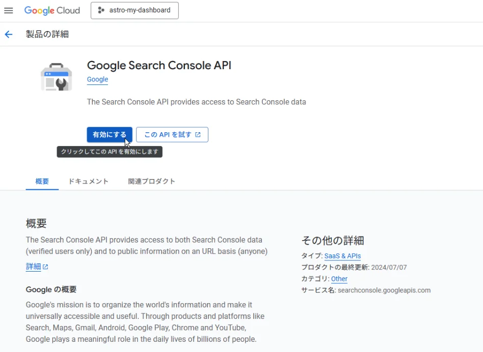 - 上部の検索バーで 「Google Search Console API」 を検索し、「有効にする」をクリックします。