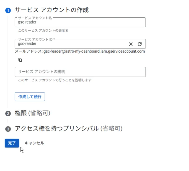 外部からSearch Consoleのデータを引っ張ってくるには、あなたの代わりにデータを見に行く「サービスアカウント(ボット)」を作成し、その合鍵を手に入れる必要があります。