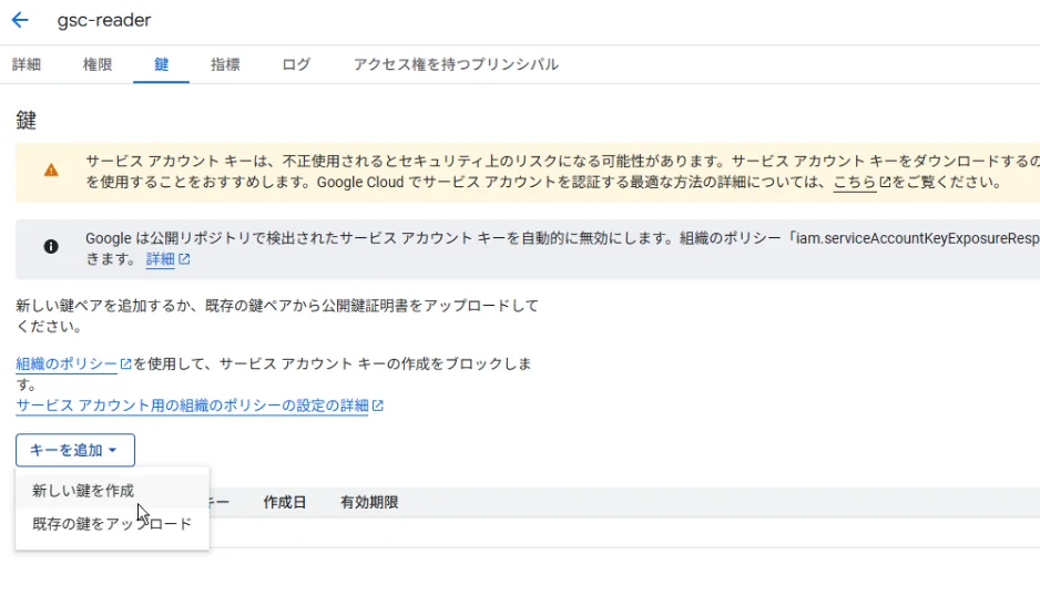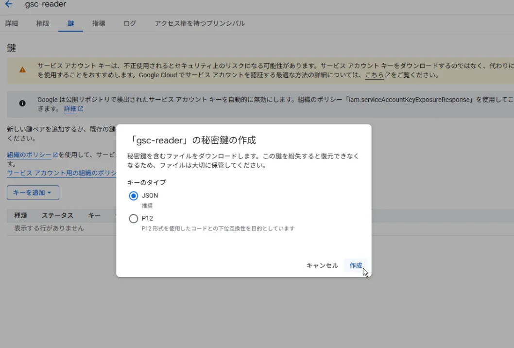 - 「鍵を追加」>「新しい鍵を作成」で JSON形式 を選んでダウンロードします。