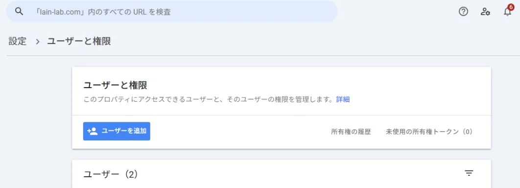 search.google.com- 左下の「設定」>「ユーザーと権限」>「ユーザーを追加」をクリック。
