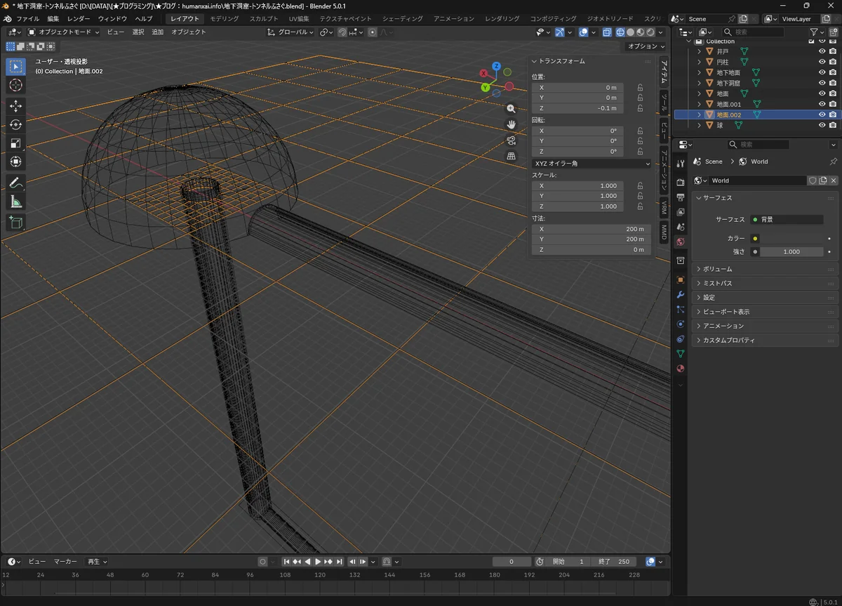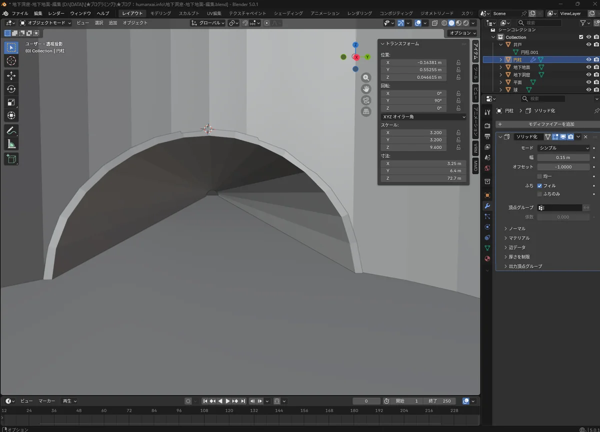 ドーム(井戸)と円柱(地下道)を「貫通構造」として接続する。