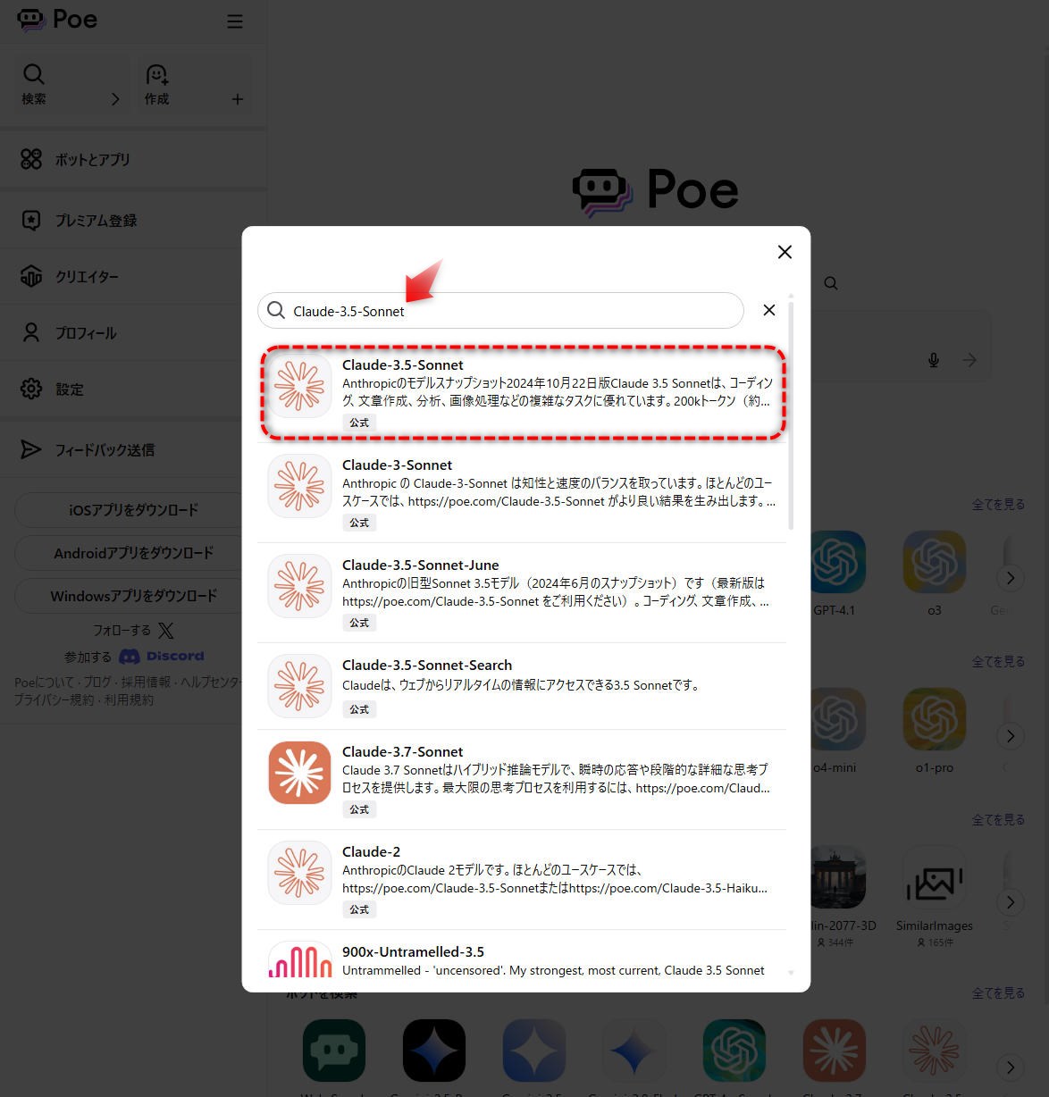 poe.comモデル選択リスト画面が出るので、「Claude-3.5-Sonnet」と入力・選択。
