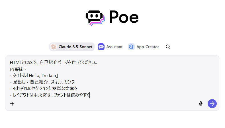 - プロンプトを入力して、HTML/CSSやコードを書いてもらう