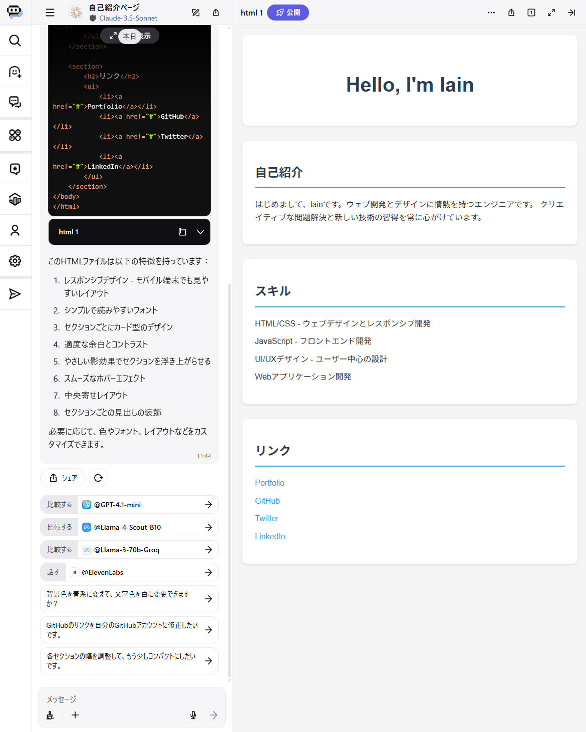 HTMLとCSSで、自己紹介ページ製作用プロンプトを投げてみます。