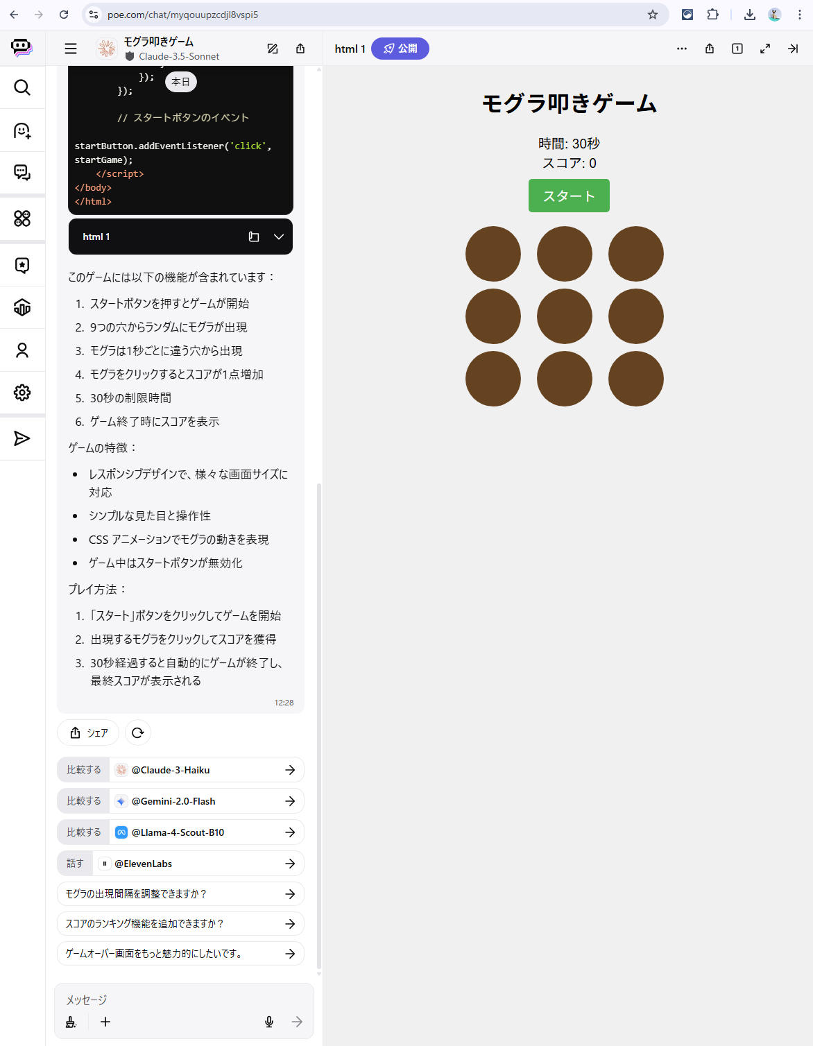 Claude Sonnet(Poe)に自然言語で依頼して、 簡単なJSゲーム(モグラ叩き) を生成してもらいます。
