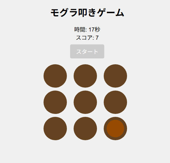 HTML+CSS+JavaScriptで、簡単なモグラ叩きゲームを作ってください。