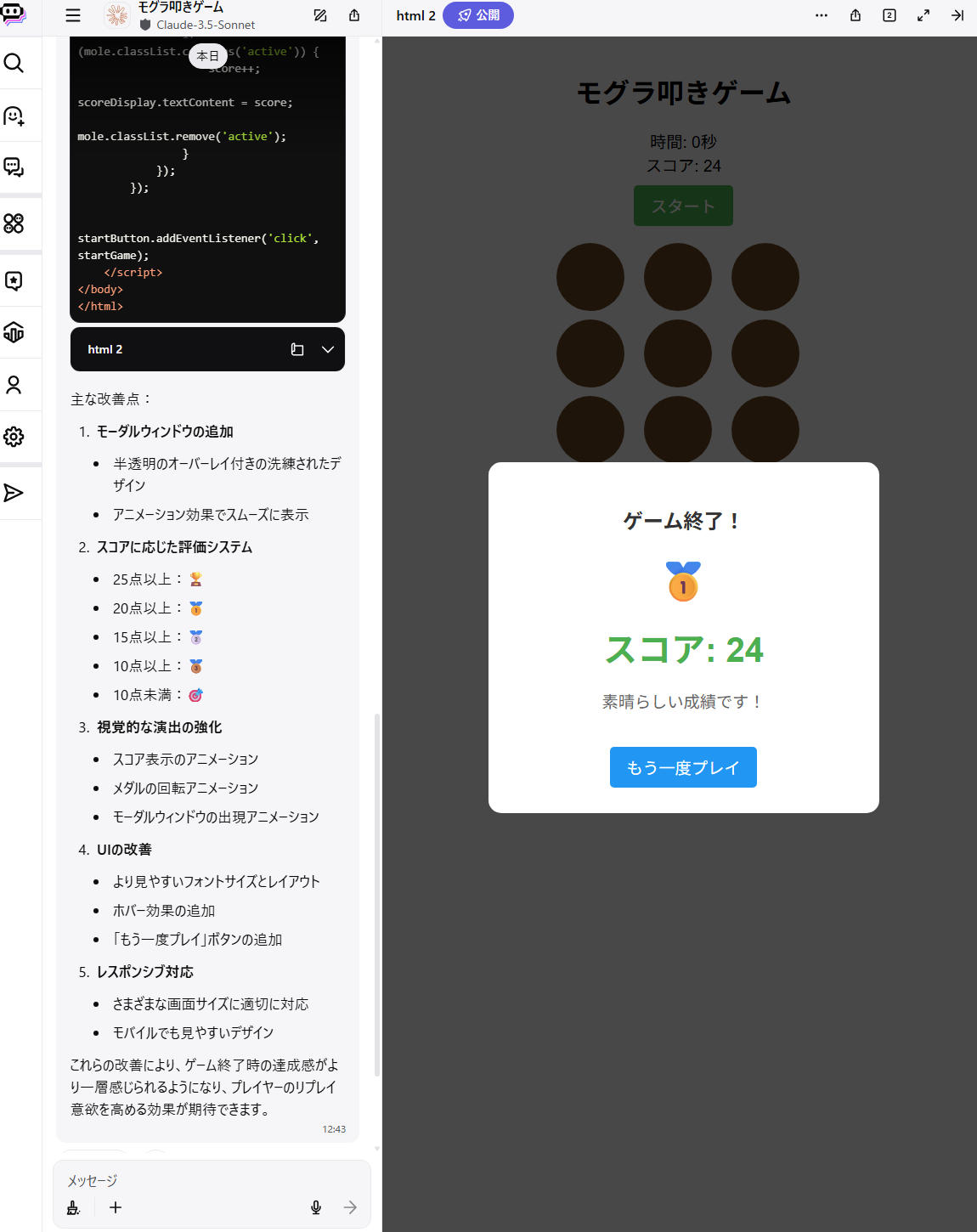 Claude-3.5-Sonnet で製作したモグラたたきゲーム(JavaScript)