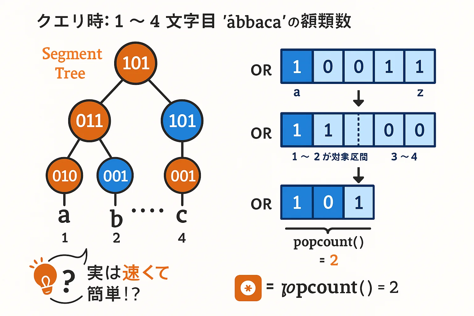 ここでは、文字列に基づいた「ビット管理によるセグメントツリー」の実装方針を、構築と**クエリ処理(区間の種類数取得)**に分けて解説します。