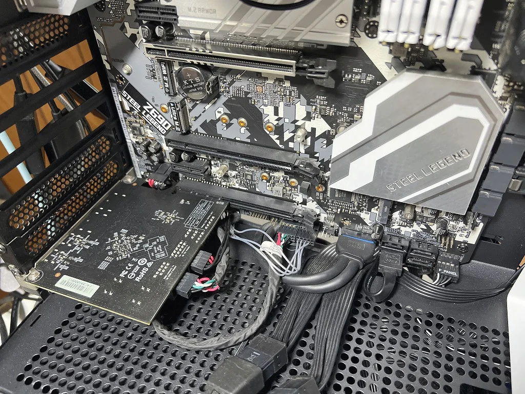 外した理由は、RTX4070TiとASRockのThunderbolt4カードをDisplayPort経由で接続し、Thunderbolt4 → HDMI2分配アダプタでモニタに接続というややこしい事をしていて、その辺でトラブルが起きてるのかもしれないと思い、原因追及の為に外しています。