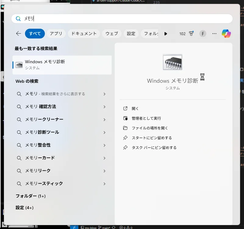 昔からある、Memetestという専用アプリを使い、メモリテストをしようかと思ったのですが、検索するとWindows11には標準でメモリ診断ツールがあるようなので今回はそれを利用。