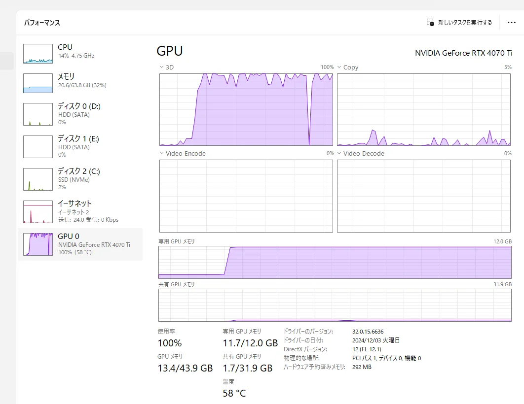 - 同時に右側にGPU温度や電力がリアルタイム表示される。