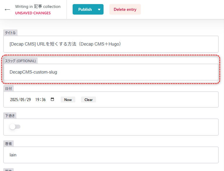 そして slug を “DecapCMS-custom-slug” のように英語で入力すれば: