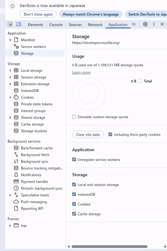 - 「Storage」→「Clear site data」にチェックを入れて「Clear site data」