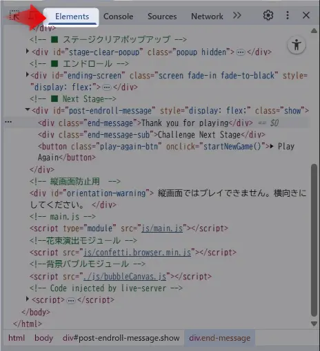 ボタンのクリックやタップ操作、タイマーなど、イベント発生時に、JavaScriptで動的にタグを追加や編集した際に、 Elementsタブで表示されているソースコードが動的に書き換わっていくので、動作確認やデバック作業が楽になります。
