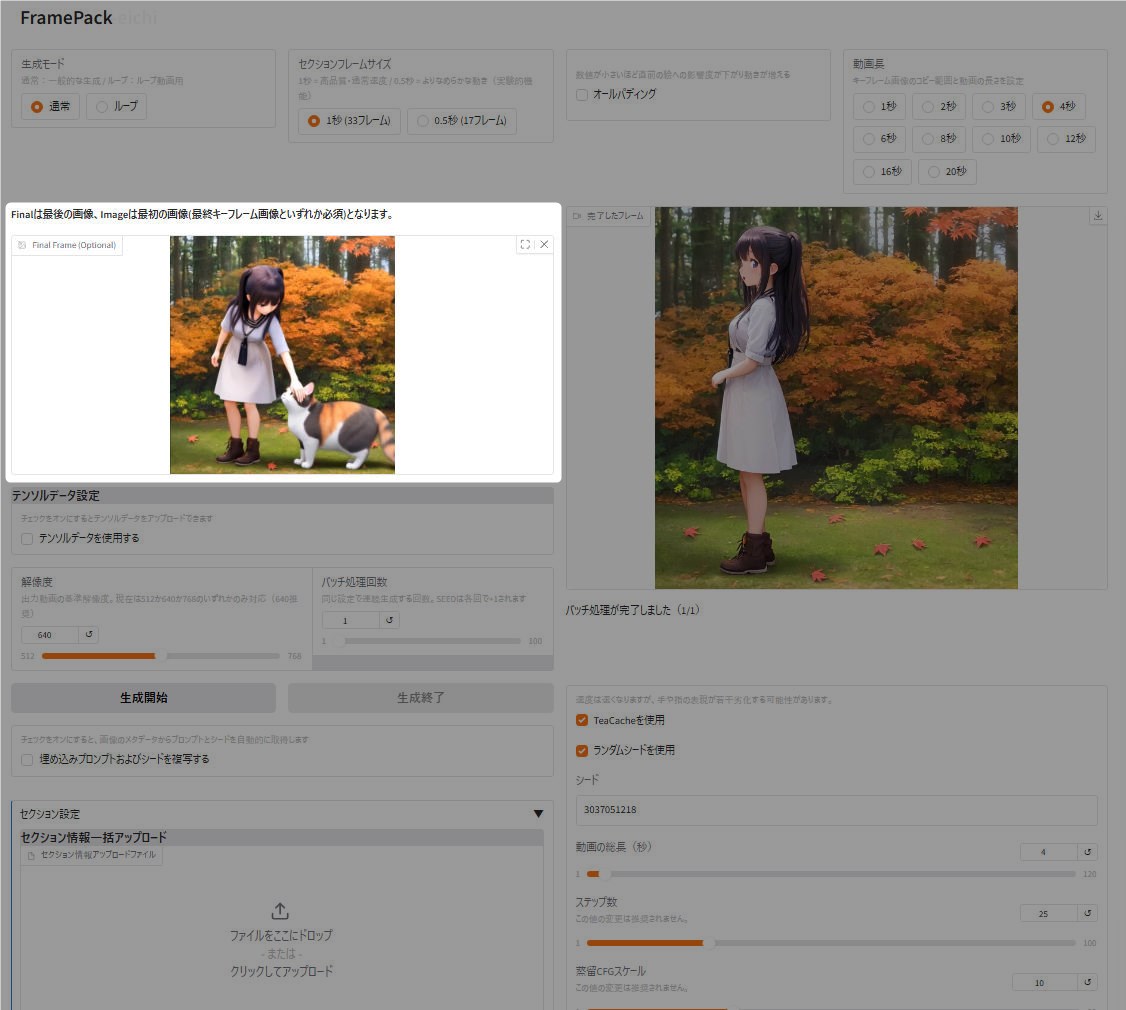成功した動画の最終フレームを抽出し、FramePack-eichiの「Final Frame」にセット。