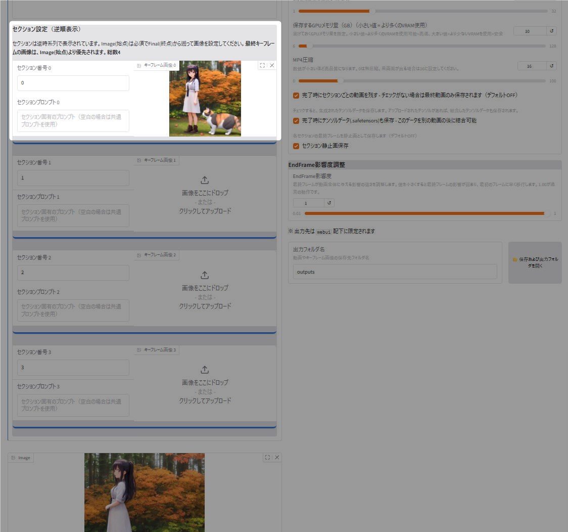 AIのアドバイスをやや無視して、FramePack-eichiの特徴の一つであるキーフレームを使って、動画を繋いでみます。