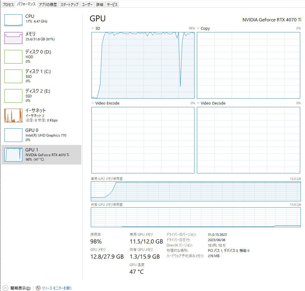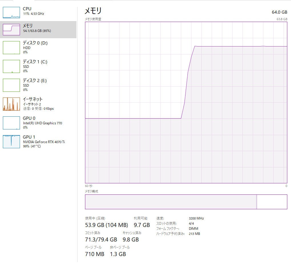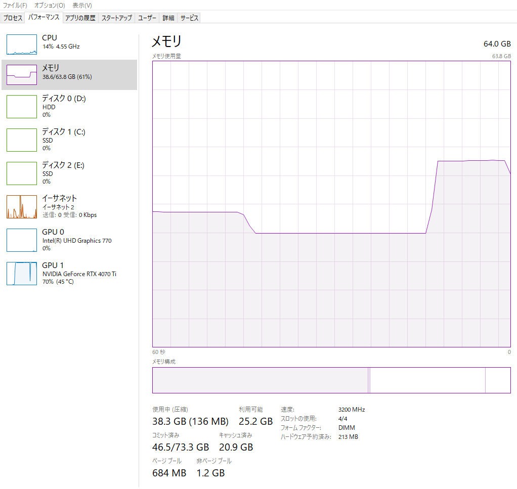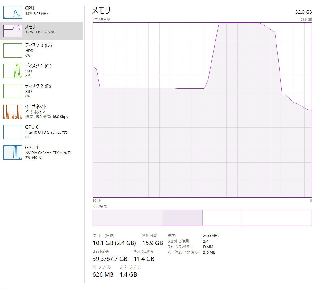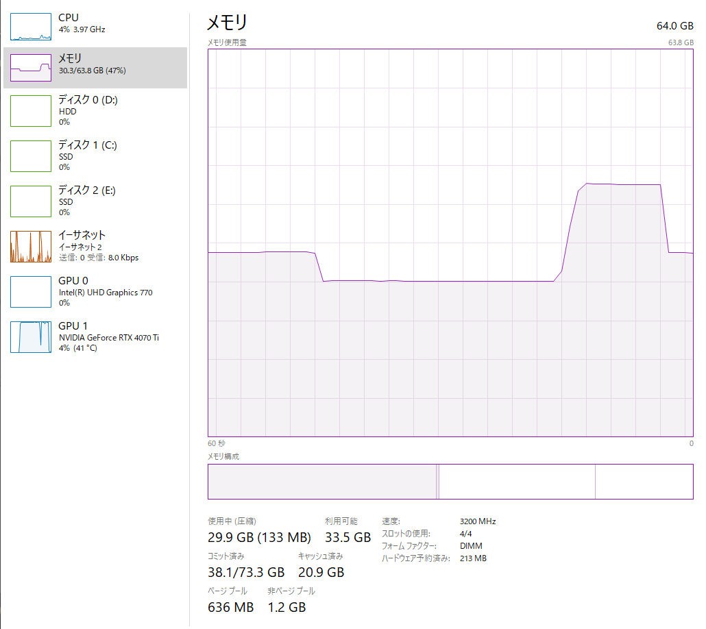 リソースモニタを見ると、GPU(3D)の使用率がMAXな他、DDR4 32GBの使用率も一時期的にMAXの32GBをほぼ使い切ってるようです。
