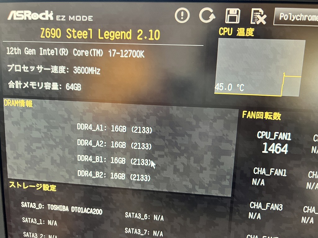 メモリ増設後、初回起動時は数分程度、時間がかかります。 BIOSが立ち上がり、DDR4 64GBの認識確認。
