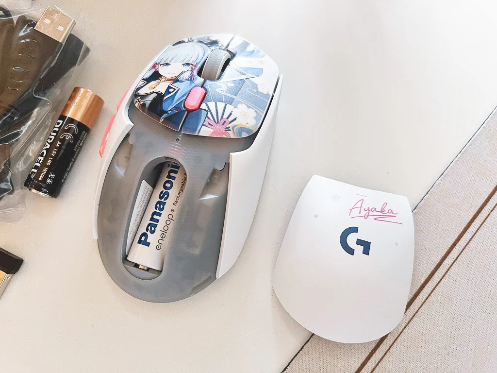 ショップG309 神里綾華マウス。LIGHTSPEEDワイヤレス + ブルートゥース、LIGHTFORCEハイブリッドスイッチ、HERO 25K光学センサー、軽量86g、単三形乾電池、POWERPLAY互換性、他
