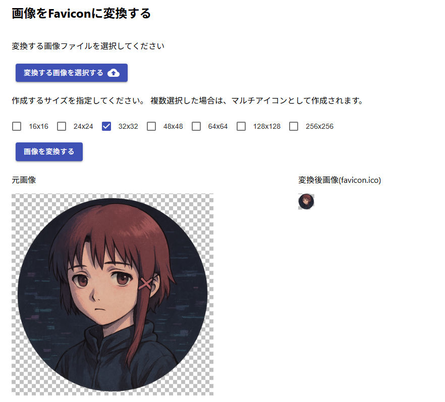 ここ対象画像をドロップして 「16 × 16px」か「32 × 32px」のサイズで作成すれば問題ないようです。