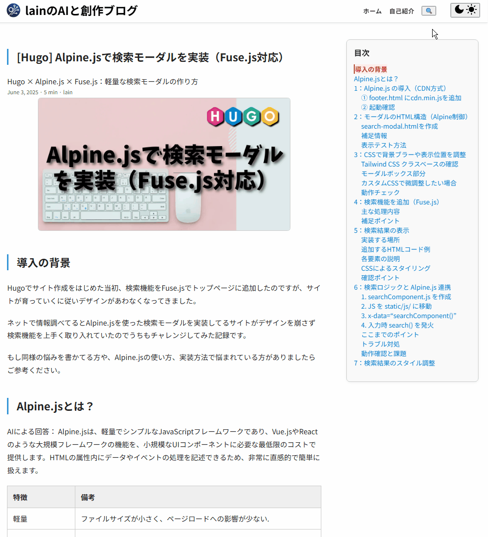ネットで情報調べてるとAlpine.jsを使った検索モーダルを実装してるサイトがデザインを崩さず検索機能を上手く取り入れていたのでうちもチャレンジしてみた記録です。