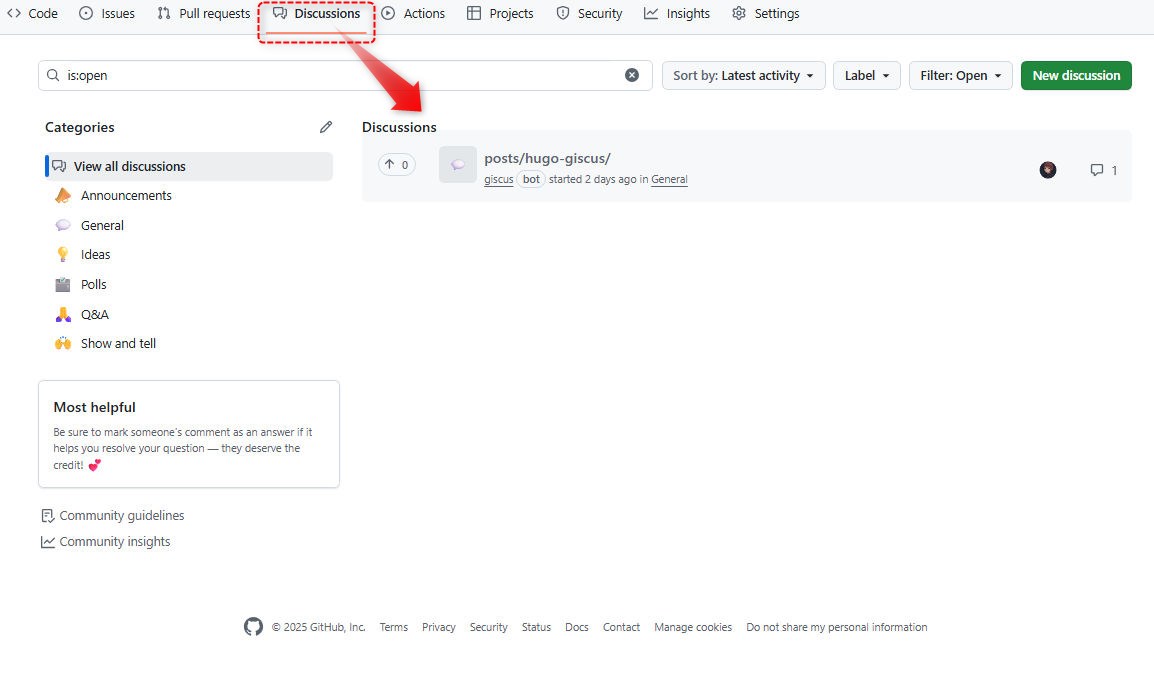 giscusのコメント管理は、GitHub Discussions上で行います。