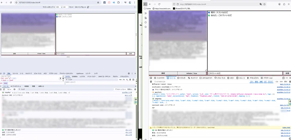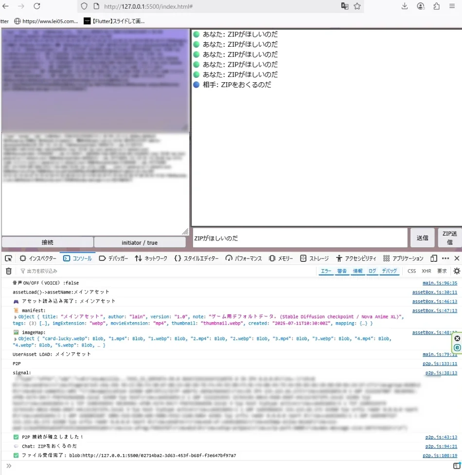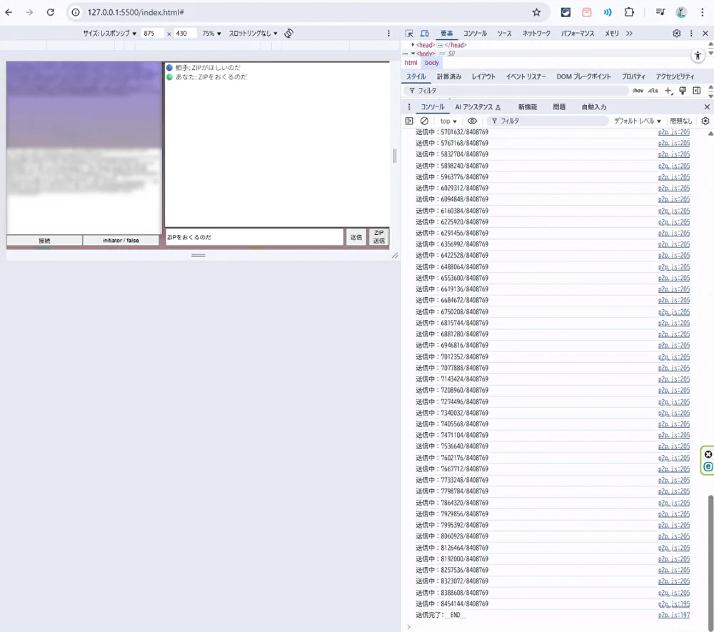 ChromeとFirefox間でP2P接続をして、チャットで簡易会話が出来るようになったほか、ファイルの送信と受信処理まで完成。