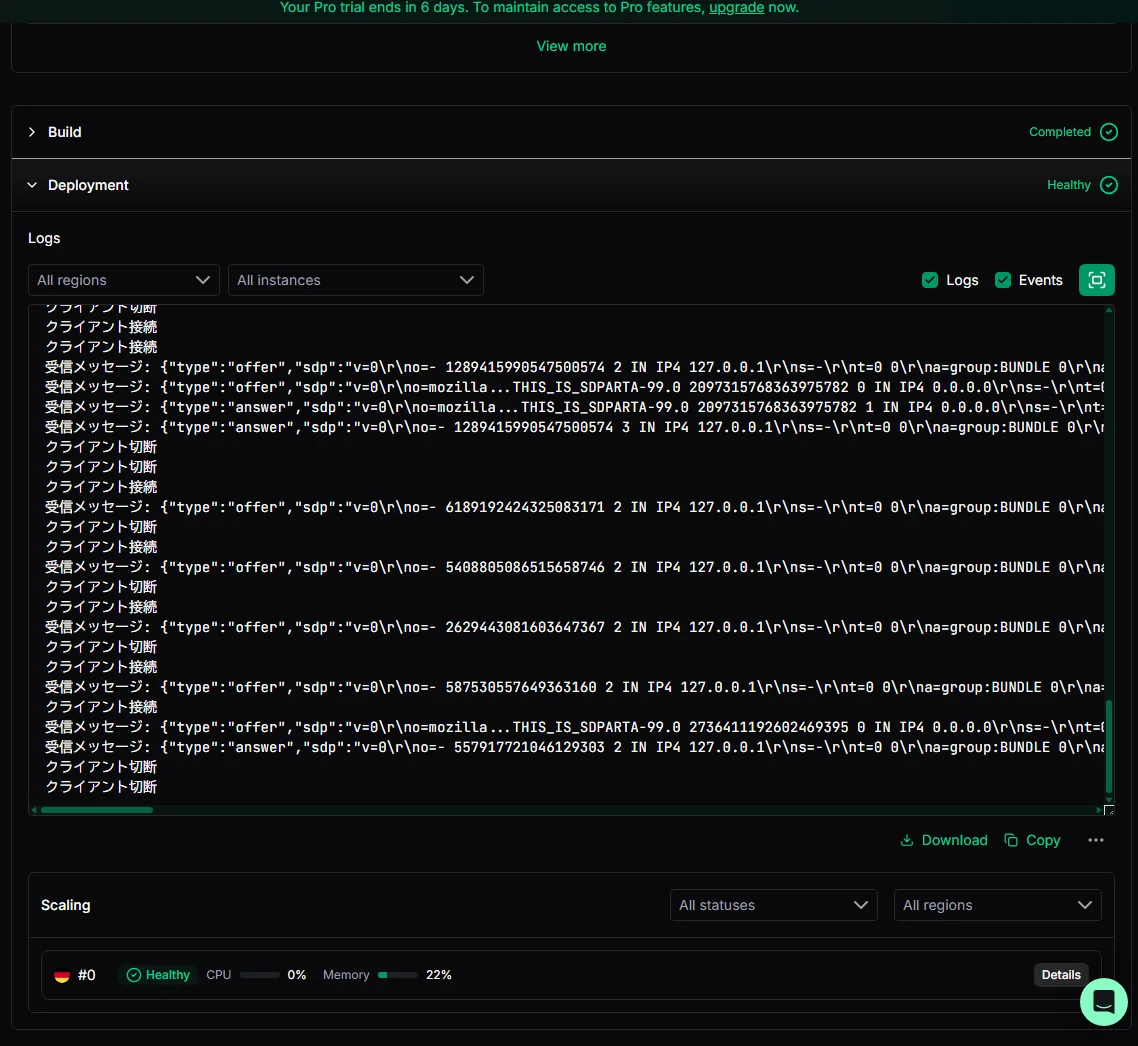 - 同一Koyebサーバに複数ブラウザ(もしくは別端末)から接続しておくと、相互にsignalが届きP2P接続が成立します。