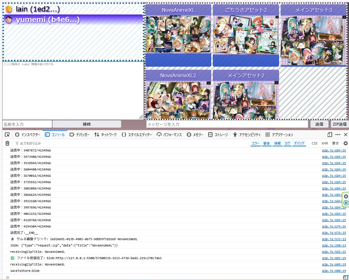 送る側も、受け取る側も、Webページを開いて接続するだけ。 チャットのように軽い感覚で、画像や音声、動画をZIPファイルとして一括送受信。 しかも、その内容は自動的に解凍されてIndexedDBへ保存される。そんな世界観を目指しました。