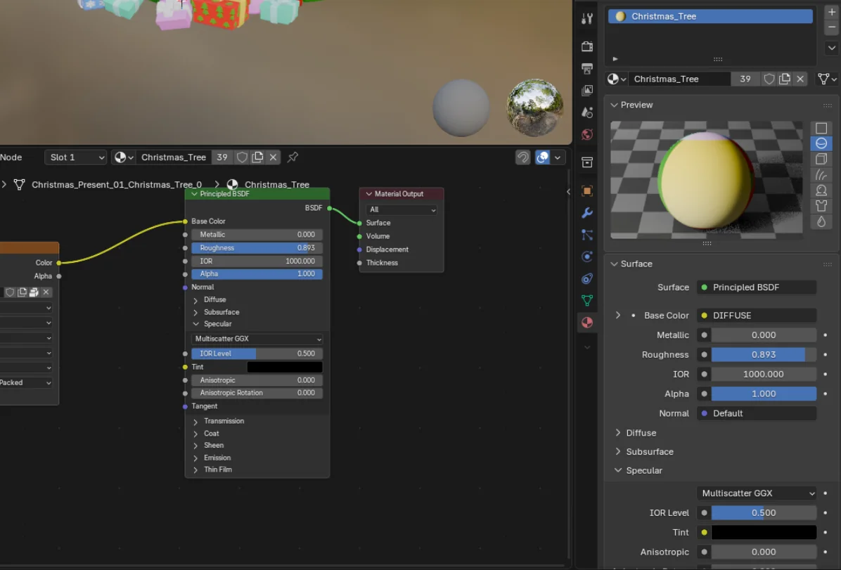 MetallicとRoughnessを Principled BSDF シェーダーに接続します。これにより、モデルのPBRマテリアルが完成します。