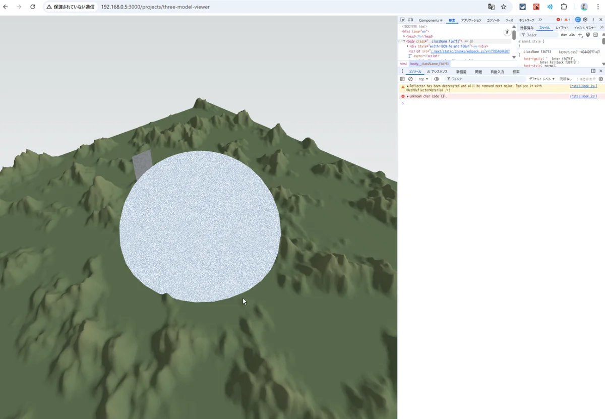 Next.js + R3F だけで、 Terrain(地形)・Sky(空)・Player(歩く) の三要素が揃った。