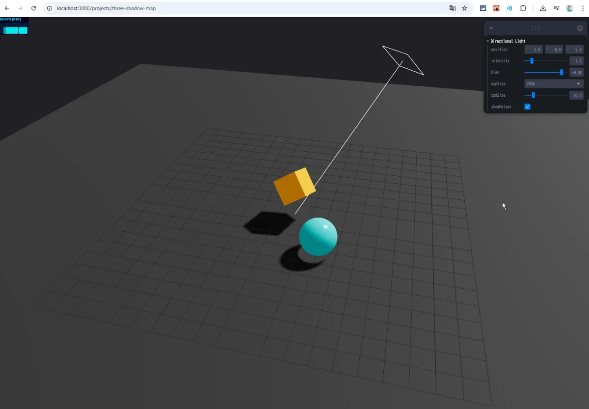 今回のデモコードでは、シャドウカメラの変更を即座にヘルパーに反映させるために useFrame 内で updateProjectionMatrix() を呼んでいます。