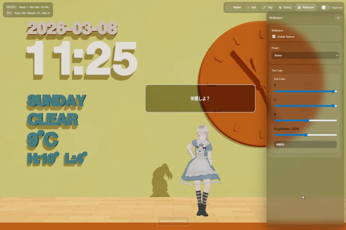 Three.js製MMD時計アプリにWallpaperカスタマイズ機能を実装。背景壁を画像対応し、Tint Color、Texture ON/OFF、壁紙プリセット切替をUIから操作できるようにした。MeshStandardMaterial + …