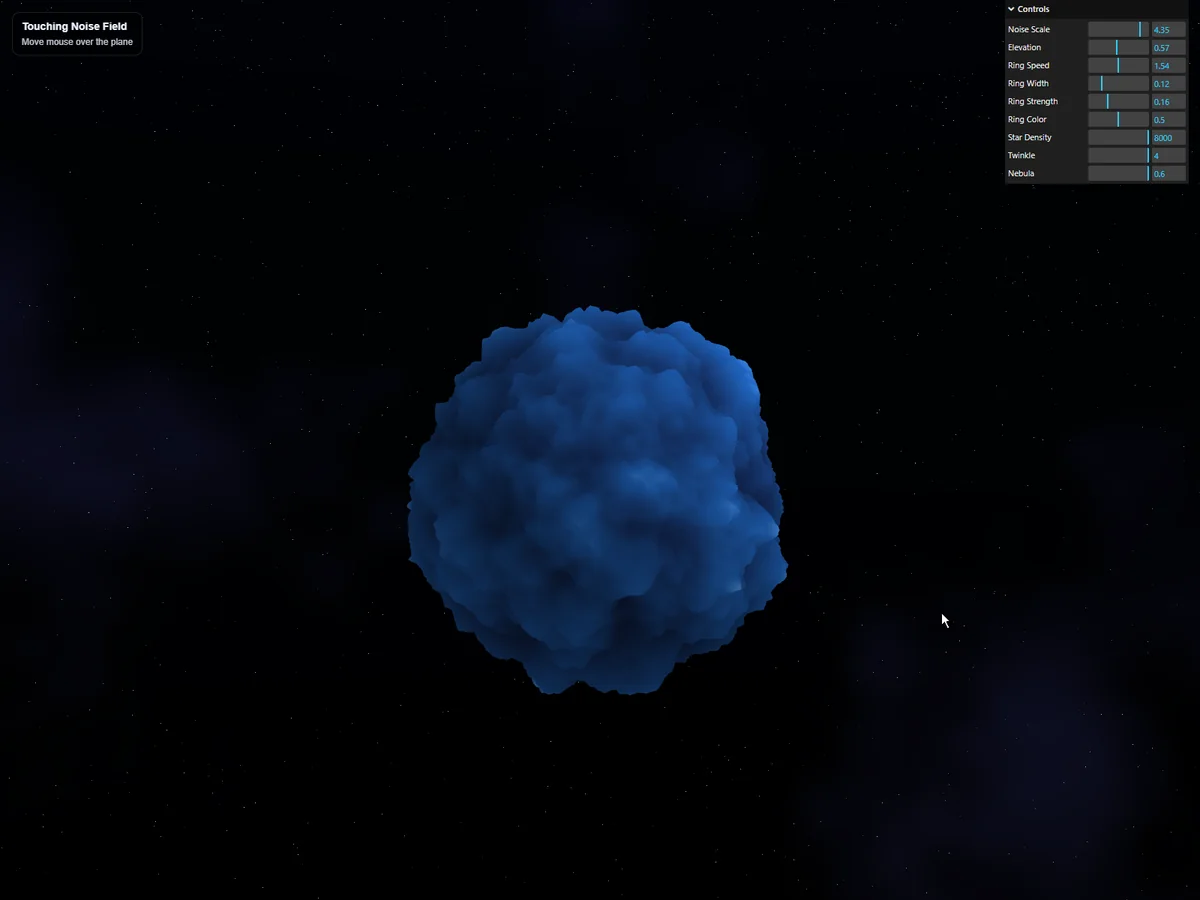 見た目としては、触ると反応するノイズ惑星 のような構成です。 単に球体にノイズを乗せるだけでなく、クリック位置を起点にしたインタラクションを加えることで、静的な地形表現から一歩進めた内容になりました。