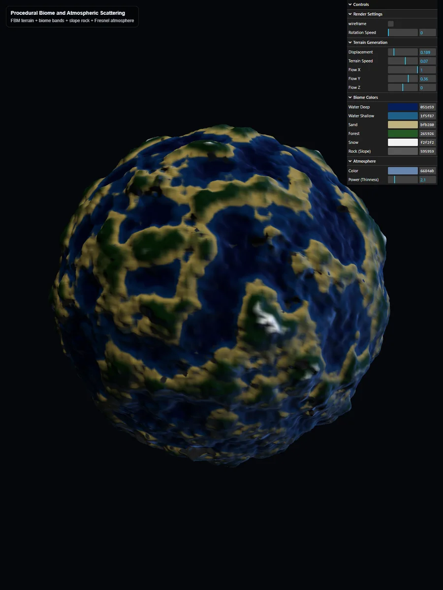 見た目としては、無機質なノイズ球から、海や森を持つ惑星へ進化した球体という構成です。 単にノイズで凹凸を作るだけではなく、色のルール・傾斜のルール・視線依存の大気を重ねることで、見た目の説得力を上げています。