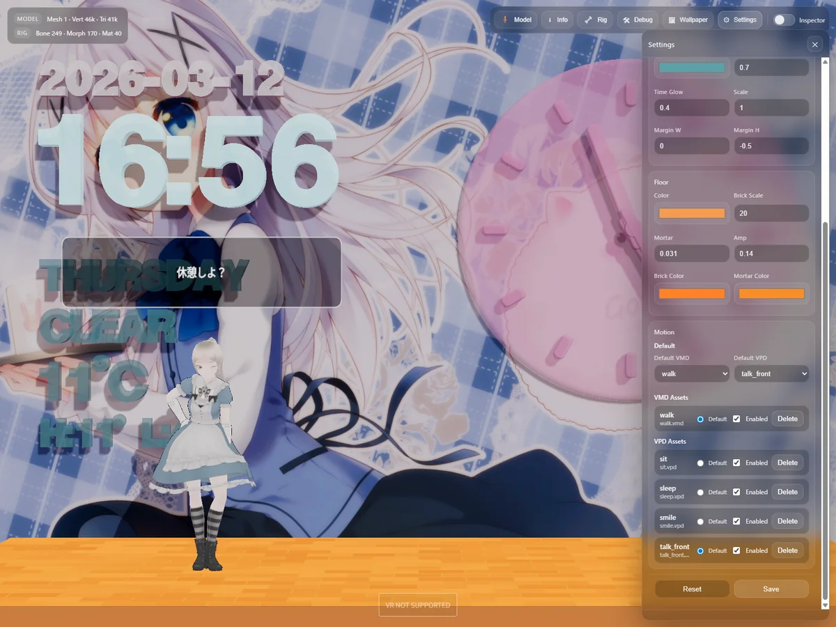 Three.js × MMD Settings UI|localStorage保存・壁紙・床Shader対応