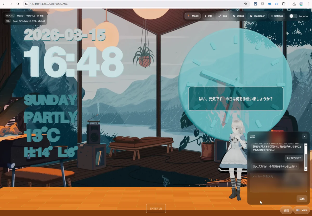 今回やりたかったのは、単なるチャット UI を置くことではありません。 メッセージ、音声、キャラクターの移動、吹き出し表示を一体化して、“時計の中に住んでいるキャラクター”として会話させること が目的でした。