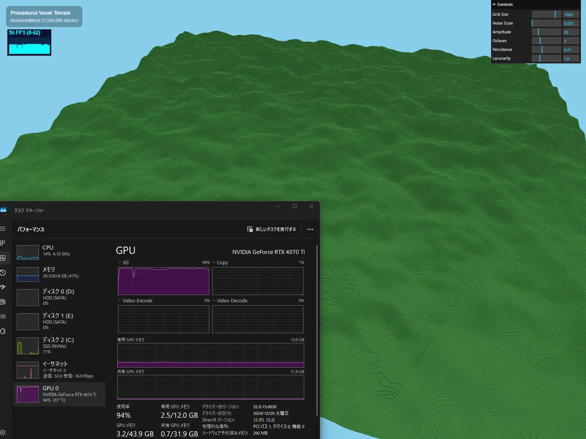 圧倒的なスケールの大地を生成し、ハードウェアの限界地点(スイートスポット)は把握できました。
