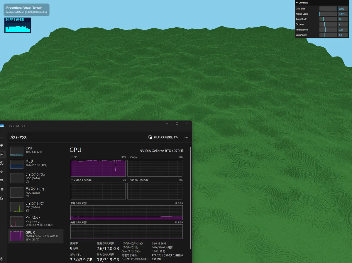 動画の後半では、いよいよ本題のストレステストに移行します。 Stats パネルでFPSを、タスクマネージャーでGPU(RTX 4070 Ti)の負荷を監視しながら、Grid Size を引き上げていきます。